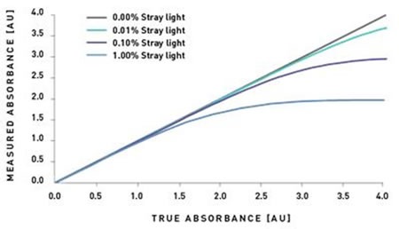 Traditional deep UV LEDs were characterized by small secondary peaks. In spectroscopy, when stray light from a broad or a secondary peak reaches the detector, it can obstruct the measurement result. As illustrated in Figure 1, the presence of stray light not only leads to reduced concentration measurement, but also results in poor linearity of measurement, thus giving a false picture of the actual condition.