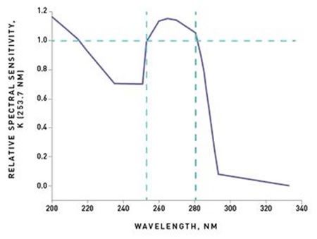 Figure 3. The action spectrum according to Sommer R, 2004. Although the 260-270nm range is regarded as the most favorable germicidal wavelength, Figure 3 reveals that absorption of UVC energy transpires across the 250 to 290nm range, which may play a role in disinfection, although at different levels. This happens to be the most important spectral parameter in these kinds of applications.