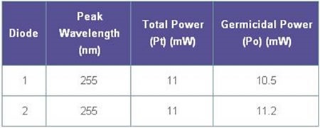 In order to demonstrate this phenomenon, two diodes having the same total integrated power (Pt) and peak wavelength are compared, as shown in the table below. While the diodes would possess the same Pt, some variation will be present in the optical power available for germicidal power (Po).