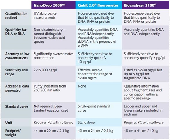 The Table shown below compares the quantification parameters of the Qubit 2.0®, NanoDrop 2000™ and Bioanalyzer 2100© instruments.