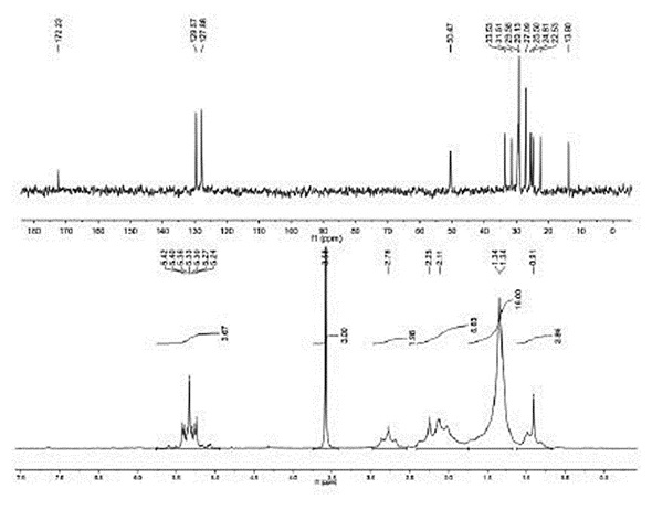 Figure 1. 50 wt. % methyl linoleate in CDCl3. Lower spectrum is 31 13 single scan H spectrum and upper scan is 1 minute C spectrum.