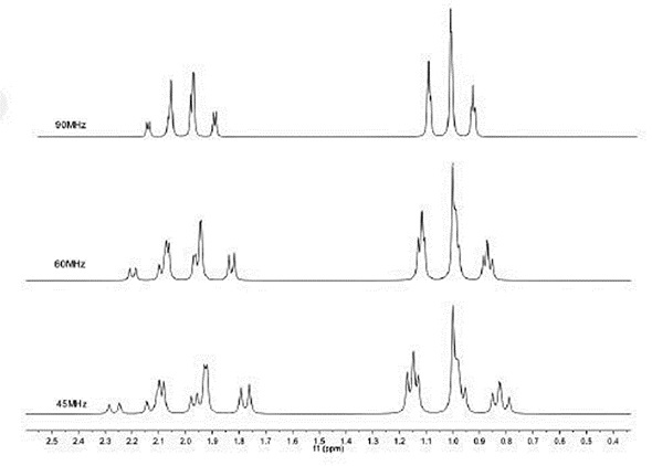 According to magnetic resonance laws, lowering the sample volume results in lower levels of signal in a linear manner. For instance, the volume of this 60 MHz spectrometer is approximately 0.2 mL, while in a capillary NMR, the volume is 0.0001 mL. When equal magnetic field strengths are used, the larger sample volume therefore provides a signal-to-noise ratio that is 2000 times greater. Moreover, reducing the field strength leads to lower levels of signal, more 2nd order effects and more crowding of spectra, all of which complicate interpretation of the spectra. Figure 2 illustrates that the ideal triplet-quartet pattern deteriorates below 60 MHz.