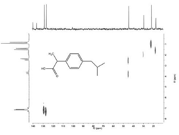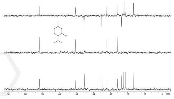 The HETCOR and DEPT measurement proves valuable in helping students to establish the identity of an unknown solution. The spectrum shown on the lower right is an ibuprofen spectrum and that shown on the lower left is a DEPT spectrum of menthol (Figures 5 and 6). Each of these spectra were recorded within just a few minutes.