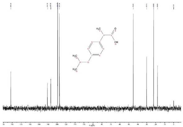 Figure 2. 13C Spectrum of 2M Ibuprofen recorded with 12 scans with a total acquisition time of 1 minute