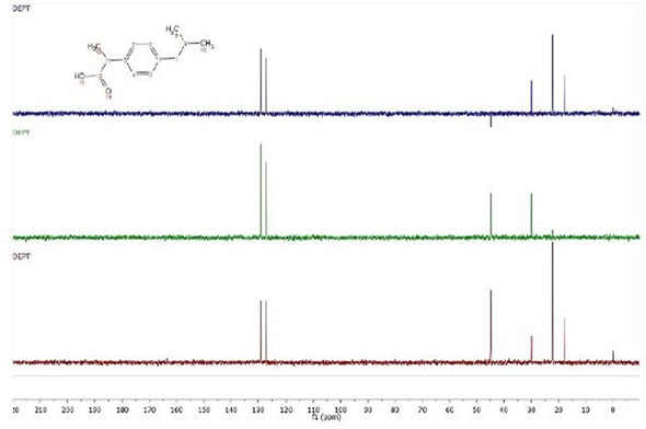 Figure 3. DEPT 45, 90 and 135 (plotted from bottom to top) spectra of ibuprofen.