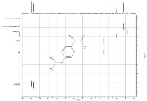 Finally, it can be seen in this experiment (figure 4) that the 13C peak at 45 ppm is actually two distinct 13C peaks, which are assigned to C7 coupled to the doublet resonance at 2.5 ppm and C11, which is bonded to the H falling at 3.7 ppm. This accidental degeneracy can even be seen on high field spectrometers (600 MHz). When ibuprofen is dissolved in DMSO, this degeneracy is eliminated and the resonances show a minimal chemical shift difference, of less than 1 ppm. This explains the interesting results achieved during the DEPT experiment, as well as the absence of 10 peaks in the 13C one-dimensional spectrum.