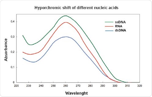 However, photometric measurements are not very sensitive. A specific threshold value needs to be reached in order to distinguish the nucleic acid from other artifacts. For samples containing other nucleic acids as contaminants, it is difficult to accurately quantify high and low concentrations of nucleic acids. Further, determination of nucleic acids by photometric methods is difficult because all nucleic acids exhibit an optimum absorbance at 260nm. However, single stranded nucleic acids can be differentiated from the double stranded nucleic acids based on their absorbance because absorbance of the former is higher than the latter. This phenomenon is known as hyperchromicity (Figure 1).
