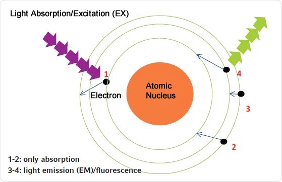 Figure 2. Principle of absorption and fluorescence measurements. 1. By light absorption, the electron is elevated to a higher energy level (absorbance measurement); 2. The electron returns to its original energy level; 3. The electron does not return directly to its original energy state; it moves to an intermediate level; 4. The electron jumps from the intermediate level to its original level (releasing fluorescent light).
