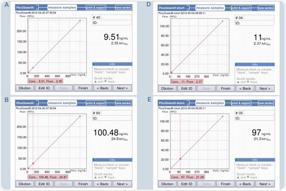 The other quantification methods that are pre-programmed apart from the PicoGreen method are quantification of RNA using RiboGreen and quantification of oligoDNA or ssDNA using OliGreen. Corresponding protocols are provided by the Quant-iT “OliGreen ssDNA Reagent and Kit” and the Quant-iT “RiboGreen RNA Reagent and Kit (RNA)”. These methods follow the same quantification process as followed in the analysis using PicoGreen.