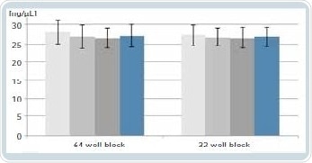 The average concentration of the PCR product was 26.82ng/μL with 2.5ng/μL as a standard deviation. Taking into account these results, the 36 specimens from the 32-well block illustrate comparable performance in all of the three runs. At a concentration of 27.14ng/μL and a standard deviation of 2.95ng/μL, similar results were obtained from the 64-well block also. These results show consistent result quality in a particular block as well as high consistency between the two blocks.