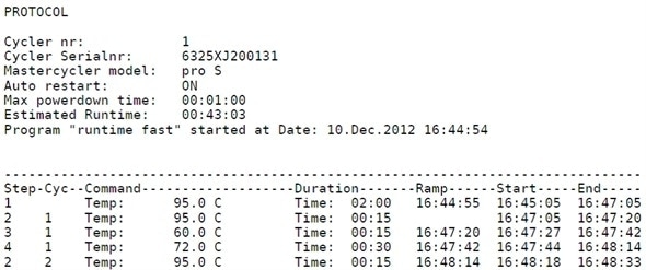 Figure 3. Screenshot from a Mastercycler pro run protocol, exported as pdf file, from the instrument software (additional information, e.g. user, program details and additional cycler settings, is not displayed in this section).