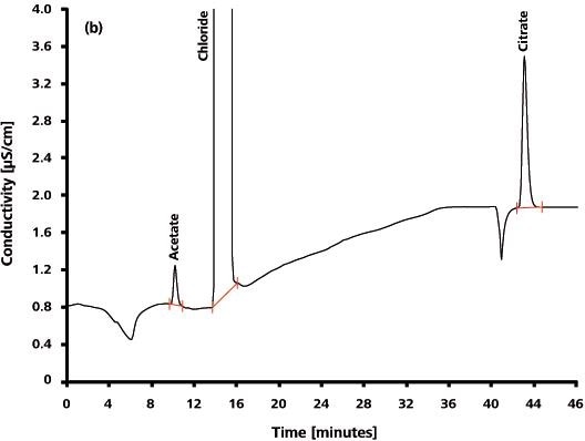 Figure 1B. IC measurement on a Metrosep A Supp 7 - 250/4.0 using Na2CO3 gradient elution, followed by sequential suppression and conductivity detection. Acetate and citrate in hemodialysis solution.