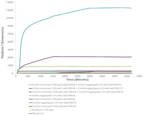 Emission curves of ThT show increased fluorescence (associated with the aggregation of alpha-synuclein protein) over time, when 100 µM of active alpha-synuclein monomer (ab218818) (light blue) is integrated with 10 nM of active alpha-synuclein aggregate (ab218819), as opposed to when 10 nM of control alpha-synuclein aggregate (purple line) is integrated with 100 µM of active alpha-synuclein monomer, or 10 nM of control alpha-synuclein aggregate (ab218817) (dark blue) is integrated with 100 µM of control alpha-synuclein monomer (ab218816). ThT ex = 450 nm, em = 485 nm.