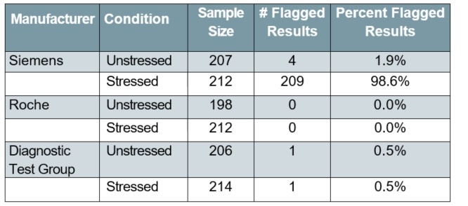 For environmentally stressed MULTISTIX 10 SG strips, the flagged sample rate was 98.6%. As a result, all further analysis of stressed performance in this work included only those reagent strips that were developed by Diagnostic Test Group and Roche, because the Siemens strips failed to give performance data post-stress.