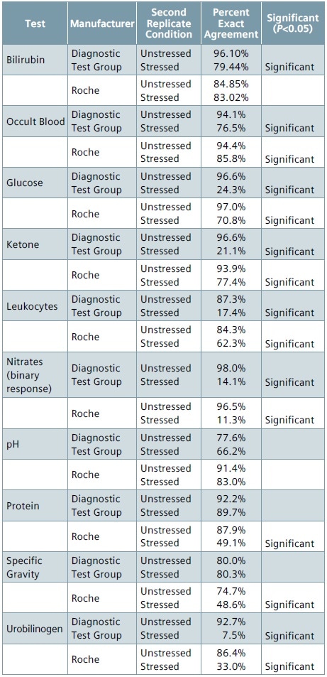 For Roche and Diagnostic Test Group, the percent agreement between the first replicate of the stressed strip and the first replicate of the unstressed strip were determined to assess the performance of environmentally stressed reagent strips.