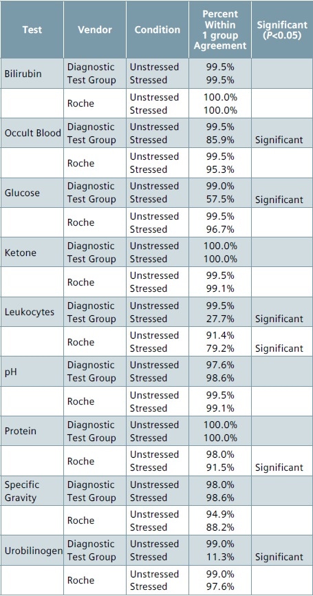 On expanding the agreement criterion to ±1 group, the disagreement was considerably reduced for the Roche strips, except for protein (91.5% agreement) and leukocyte (79.2% agreement), and with both agreement rates being considerably different from the unstressed (control) agreement.