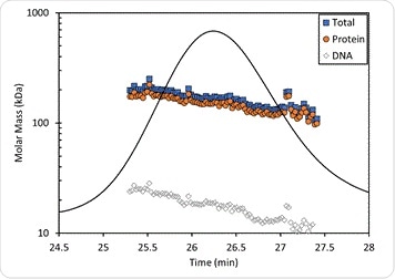 • MALS with SEC, size-exclusion chromatography (SEC-MALS) and protein conjugate analysis in order to arrive at the molar mass of the complex and the DNA fraction