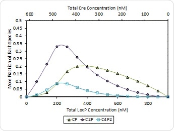 Figure 8. Molar composition of Cre-loxP complexes formed at pH 7.5 – (Cre)(loxP) (CP, green triangles), (Cre)2(loxP) (C2P, purple circles) and (Cre)4(loxP)2 (open squares). The composition of free Cre and loxP monomers has been left off for clarity.