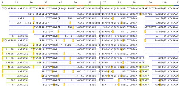 The image below shows how the antibody sequencing software from Rapid Novor identifies the peptides in a protein sequenced de novo. The bold font captions show those amino acids which are validated by the MS/MS fragment ion peaks. The peptides which overlap are a collective verification that each amino acid in the antibody has been correctly identified.