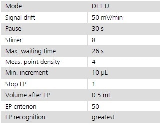 For the determination of the blank, 4 mL of formic acid and 50 mL of acetic anhydride are placed into a titration beaker. The stirred solution is then titrated with c(HClO4) = 0.1 mol/L in glacial acetic acid until the equivalence point is passed. The volume at which the equivalence point is achieved corresponds to the blank value.