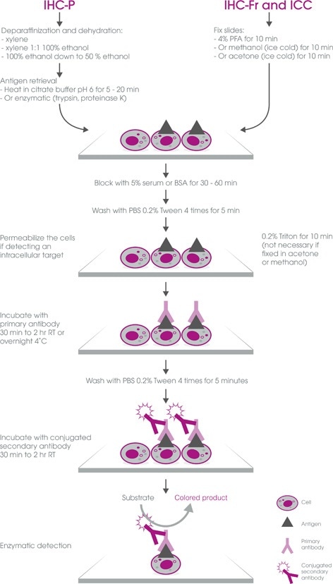The following diagram illustrates a typical immunostaining protocol. When direct immunostaining is carried out, there is no need to incubate the primary antibody-antigen complex with the secondary antibody. When fluorescent labels are used, the last step, in which a soluble substrate is added, is left out.