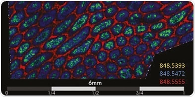 Understand the complete advantage of eXtreme Resolution. In the figure above, a three-color image from rat testis shows distributions of three ions at nominal m/z 848 and varying only by 300 MDa.