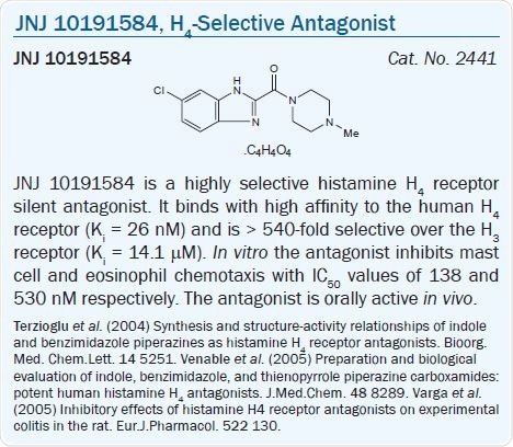 As discussed, most first-generation, imidazole-containing H3 receptor ligands also have a considerable affinity for the H4 receptor. Yet, selective H4 receptor ligands have been described.