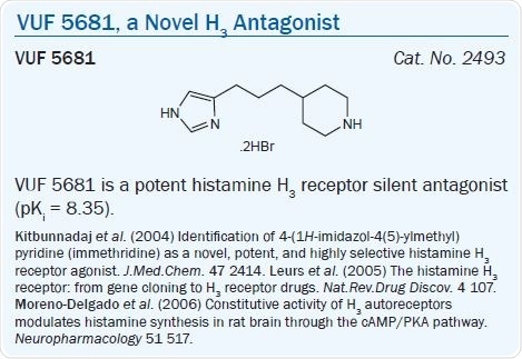 The compound VUF 5681 was found to be a neutral H3 antagonist (or ‘silent’ antagonist),82 findings which were confirmed recently in studies investigating constitutive activity utilizing rat brain cortex.83 It has been revealed that the functional activity of proxyfan relies on the system employed, ranging from inverse agonist to full agonist. Hence, proxyfan can be classified as a protean agonist, both in vitro and in vivo.64,84