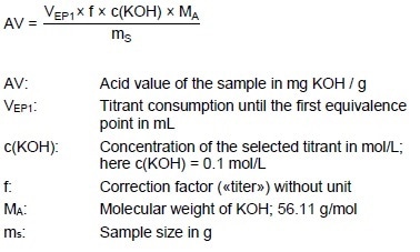 The acid value corresponds to the amount of carboxylic acid groups in alkyl resins, polyester acrylate resins or mixtures and is stated in mg KOH per g sample. It is also utilized in evaluating plasticizers, where acid values should be as low as possible.