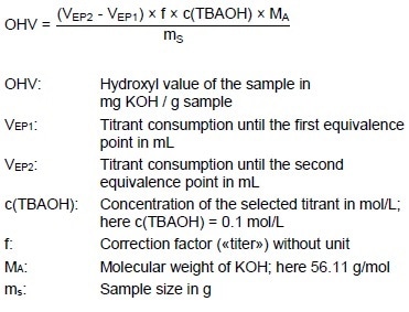 The hydroxyl value supplies information about the degree of esterification within the sample and is given in mg KOH per g sample.