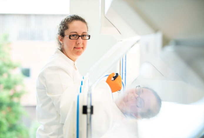 Researcher using the portable microplate reader (Byonoy – Absorbance 96) in an anaerobic chamber. Image Credit: Lablogic