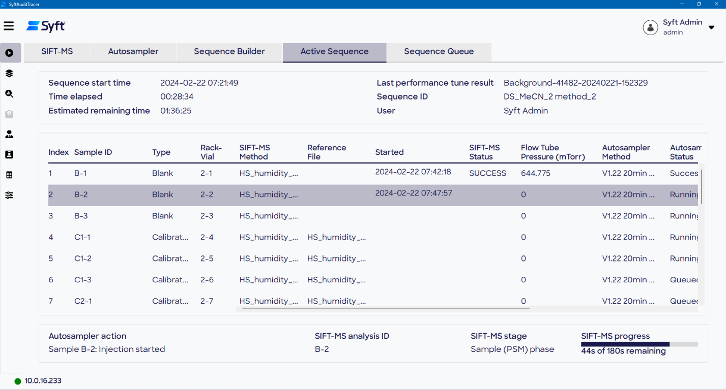 The instrument’s status can be closely monitored via the Run page of SyftAuditTracer, which enables rapid appraisal of the system before conducting analysis. It is of utmost importance to tune the performance of SyftTracer before conducting the first analysis of the day.