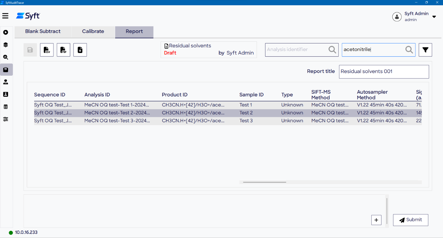 Once a sequence process is complete, the resulting data can be processed for later inclusion in an electronically signed PDF report. Processing is carried out within SyftAuditTracer and does not modify raw data files.