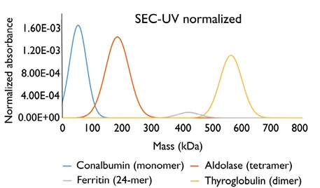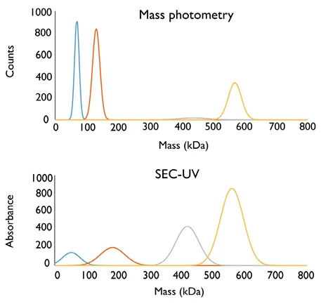 SEC-UV suggests that thyroglobulin and ferritin are the most abundant in this example, while mass photometry suggests that conalbumin and aldolase are the most abundant. To properly understand this discrepancy, it is important to consider the fundamental principles of each technique and its use.