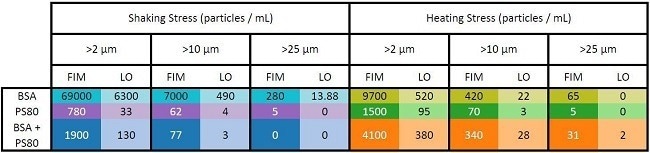 The FIM results (Figure 4 and Table 2, dark color bars and table entries) showed that shaking stress produced more protein aggregates than heating stress when applied to samples containing solely protein. These results also indicate that polysorbate protected the protein more effectively against shaking stress than heating stress.