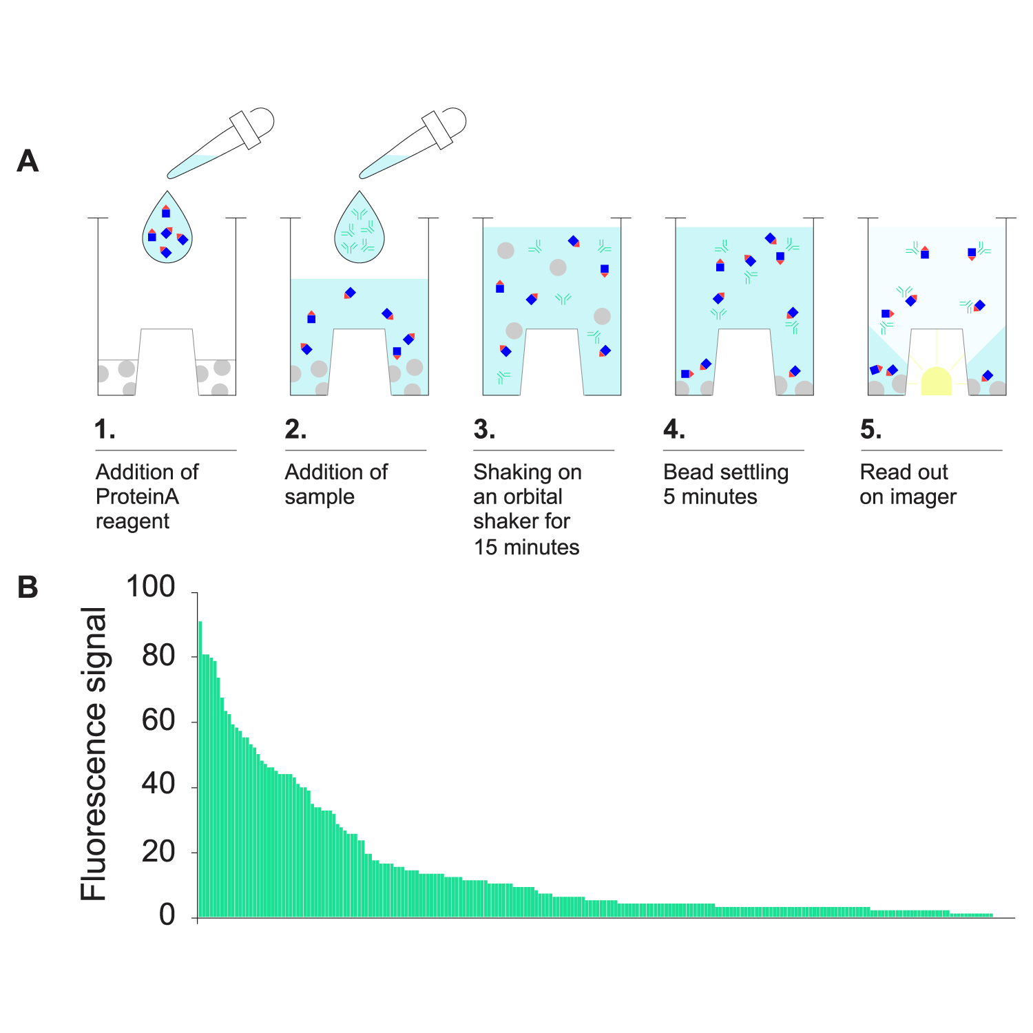 A) Schematic protocol for F.QUANT Fc Titer Assay. B) A minipool of IgG1-expressing CHO cells was dispensed into 384-well plates using the UP.SIGHT 2nd Gen. On day 10, plates were imaged and confluency determined with C.STUDIO. The top 25% clones (227 clones) were picked into 96-well plates. 3 days later, 5 μl supernatant was used for F.QUANT-based titer measurement. Ranked relative titer values are shown. Image Credit: CYTENA GmbH