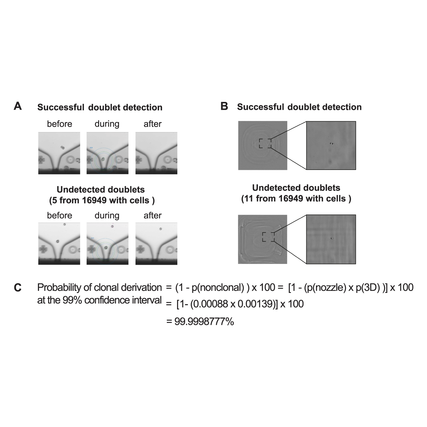 A) Nozzle images. Top: doublet detection. Bottom: no doublet detection; nozzle imaging system fails at detecting the doublet. This accounts for the nozzle system detection error. B) Individual stack images from 3D well imaging. Top: doublet detection. Bottom: no doublet detection; 3D well imaging system fails at detecting the doublet. This accounts for the 3D well imaging system detection error. C) A clone is of non-clonal origin if both imaging systems failed to detect a doublet. The error rate of each imaging system was statistically derived with the Wilson Method after image inspection and the resulting probability of clonal derivation was calculated as shown. Image Credit: CYTENA GmbH