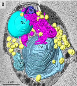 Fig.3: The interaction between colv organelles and cellular structures. A) TEM images of cells treated with lanthanoid nanocrystals (La). B) 3D reconstruction of 2 μm-thick slice from array tomography data set shows different organelles vacuoles and vesicles. Nucleus (Nu), mitochondrion (Mt), lipid droplets (Li), posterior vacuole(PV), cytopharynx (Ph) Colv organelle (Or) and smaller vacuole (Va). Image Credit: doi: 10.1128/mbio.01921-23.