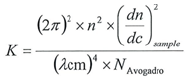 ARGEN spontaneously calculates the value of K upon entry of n and (dn/dc) sample on the experiments page. Within limits of assessing scattering at 90°, the Zimm Equation is reduced to: