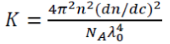 where I(q,c) is the excess Rayleigh scattering ratio (in units of cm-1), the quantity assessed by the light scattering instrument, identical to its value from the polymer solution subtracting the pure solvent’s value.