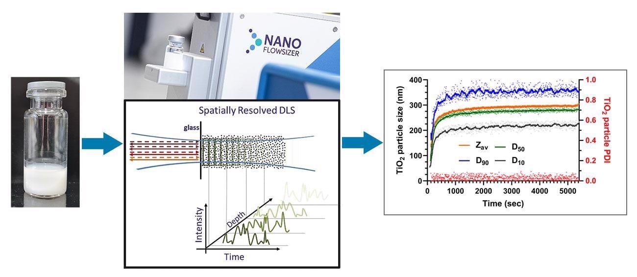 To monitor TiO2 (and other) nano-synthesis processes more effectively and efficiently, via direct, inline size analysis, InProcess-LSP (a Dutch Process Analytical Technology [PAT] company) has invented and commercialized a new technology for NP size characterization in highly turbid suspensions without the need for diluting. This technology, termed Spatially Resolved Dynamic Light Scattering (SR-DLS), not only provides rapid real-time sizing of highly turbid nanosuspensions, but also allows to perform such analysis for many different sample/process environments and during suspension flow, offering the desired inline NP sizing capability. Currently, an instrument based on SR-DLS (the Nanoflowsizer) is commercially available and provides automated TiO2 particle sizing in concentrated, turbid, and flowing suspensions during both particle formation and processing.