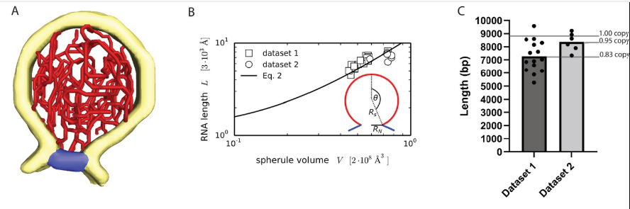 Figure 2. Characterization and quantification of the viral RNA. A: 3D structure of the ds RNA filament obtained by Amira Software. Yellow: membrane, Red: RNA and blue: neck complex base. B: Increase of RNA lengths with spherule volume shown in a graph. C: Estimation of dsRNA length (in base pairs) for two datasets, and average copy numbers per spherule. Image Credit: Thermo Fisher Scientific - Software
