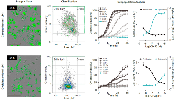 Note. HT-1080 fibrosarcoma cells (5,000 cells/well) were treated with Camptothecin (CMP; Cytotoxic) or Cycloheximide (CHX; Cytostatic) in the presence of the Incucyte® Cytotox Green Dye. Phase and fluorescent images illustrate how Cell-by-Cell Analysis can be utilized to detect live/dead cells at 24 h (masking of dead cells shown). Classification plots to identify green (dead) population (second column), time-course graphs (third column), and concentration-response curves (fourth column) show a difference in the effect of a cytotoxic and cytostatic compound. Data presented as Mean ± SEM, n = 3.