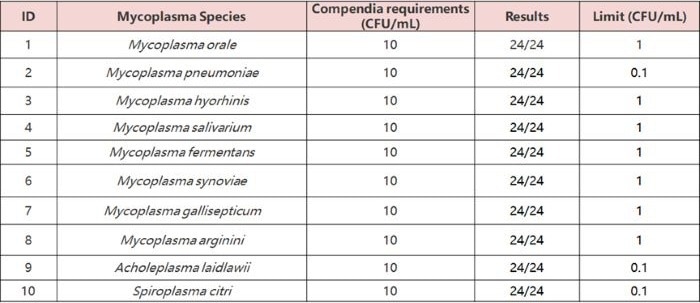 Tested 10 mycoplasma standards (10 CFU/mL) in 24 replicates each; all returned positive - meeting/exceeding EP 2.6.7 standards (10 CFU/mL).